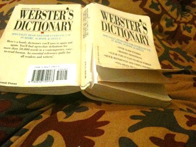 I shuffled over to my dictionary this evening to find that its spine had been fully broken, and the cover had been ripped!! Although I admit that the living room floor is not the safest place for an unprotected, pocket-size dictionary, I suspect foul play.